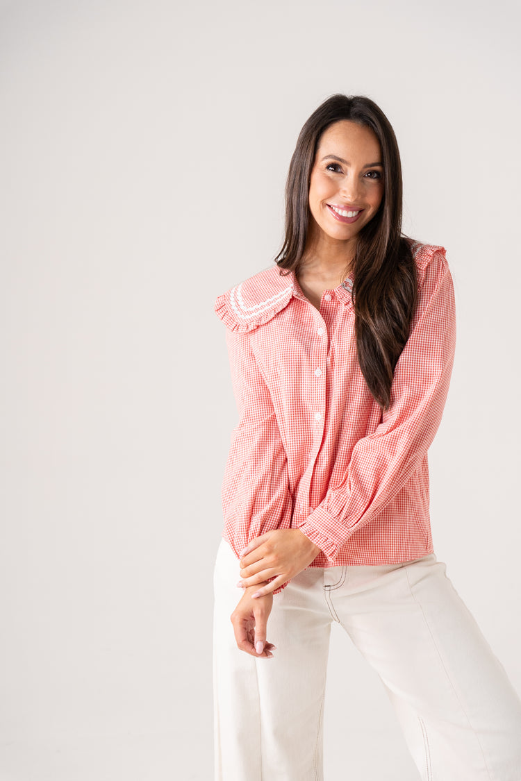 The Ally Frill Collar Shirt combines timeless gingham styling with contemporary design details. Crafted from a breathable cotton mix, this long-sleeved piece features a distinctive oversized collar with pleated trim that adds dimension and visual interest. Button front closure and coordinating piped cuffs ensure a polished finish, while the red gingham pattern delivers classic charm with modern appeal. The thoughtfully designed collar and cuff detailing elevates everyday wear into something distinctly sophisticated.