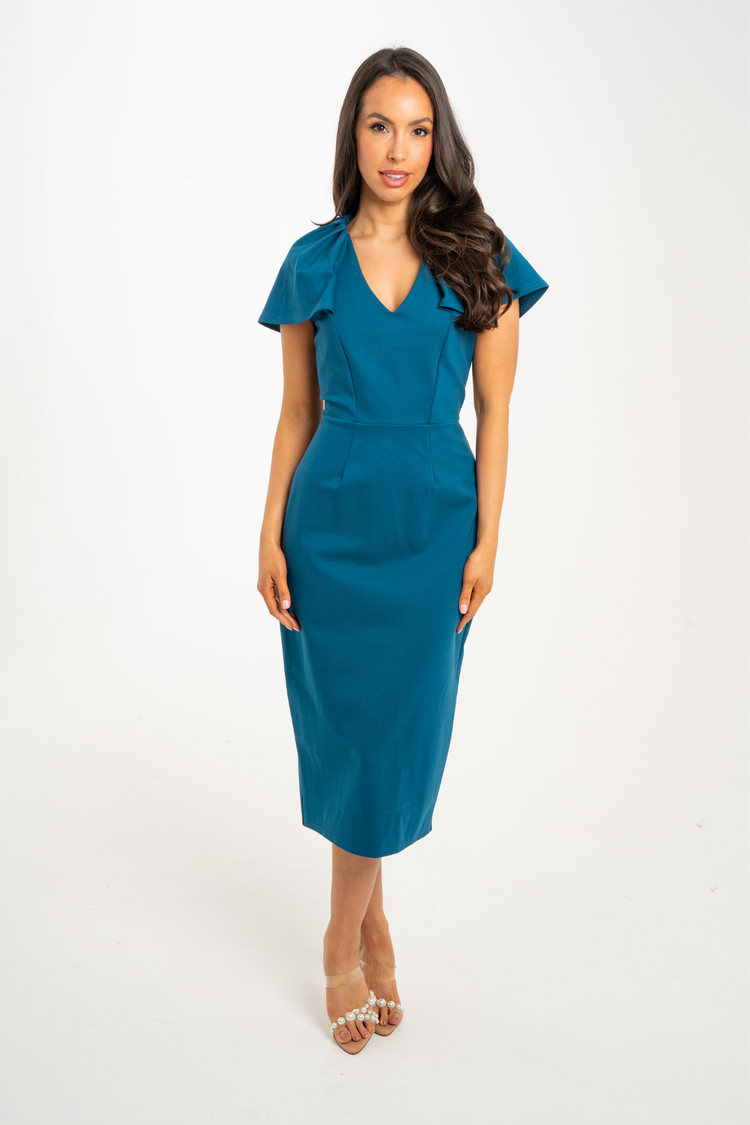 Celine Pleated Shoulder Dress In Teal