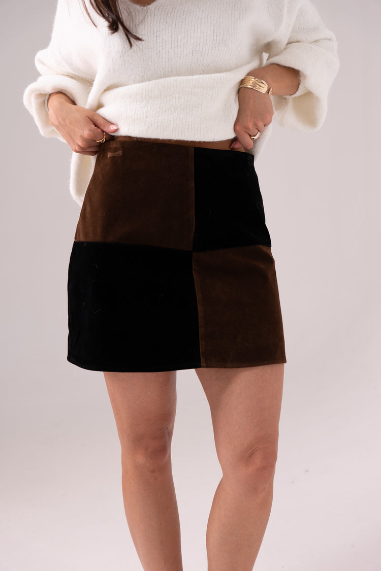 Crafted from soft faux suede and fully lined for comfort, this mini skirt features a sophisticated quartered design that adds subtle texture and dimension. The side zip ensures a sleek fit, while the contrasting black and chocolate tones bring a refined, versatile look perfect for both casual and dressier occasions.