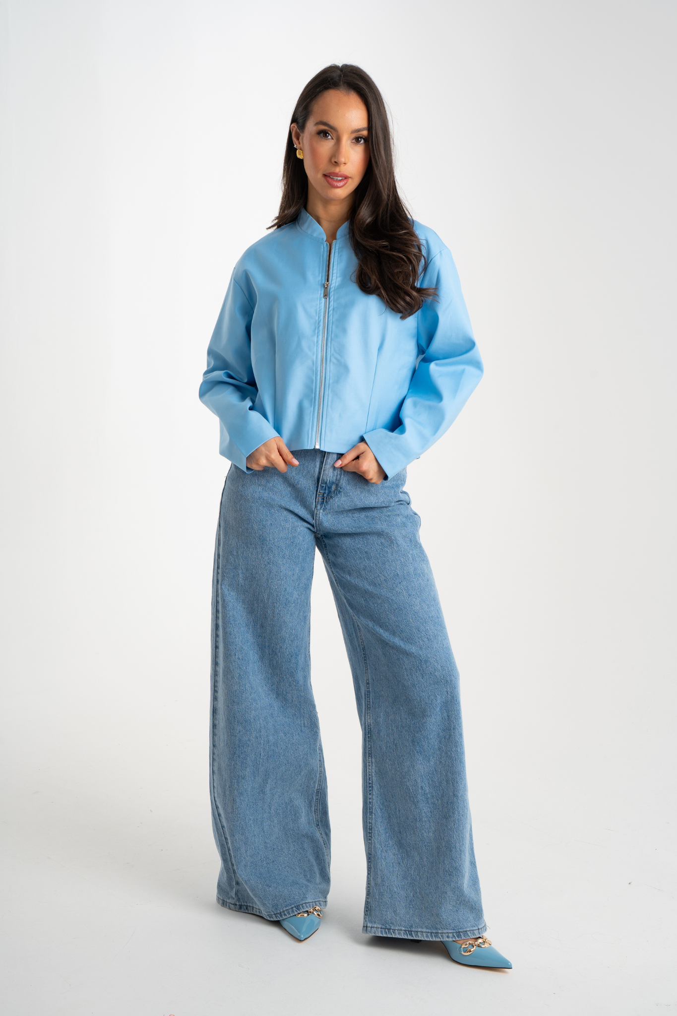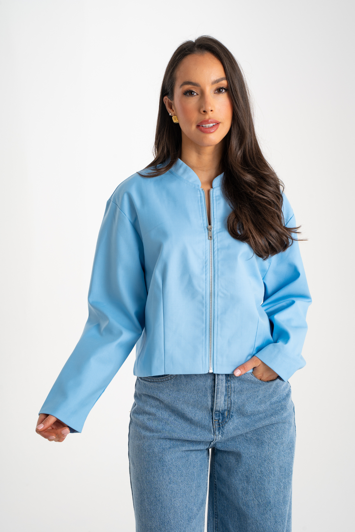 The Daisy Zip Jacket in Sky Blue is a stylish and practical addition to any wardrobe. Featuring a convenient zip front, round neck, and long sleeves, this jacket is made from a comfortable cotton mix material in a beautiful sky blue colour. Perfect for everyday wear or a statement piece for any occasion.