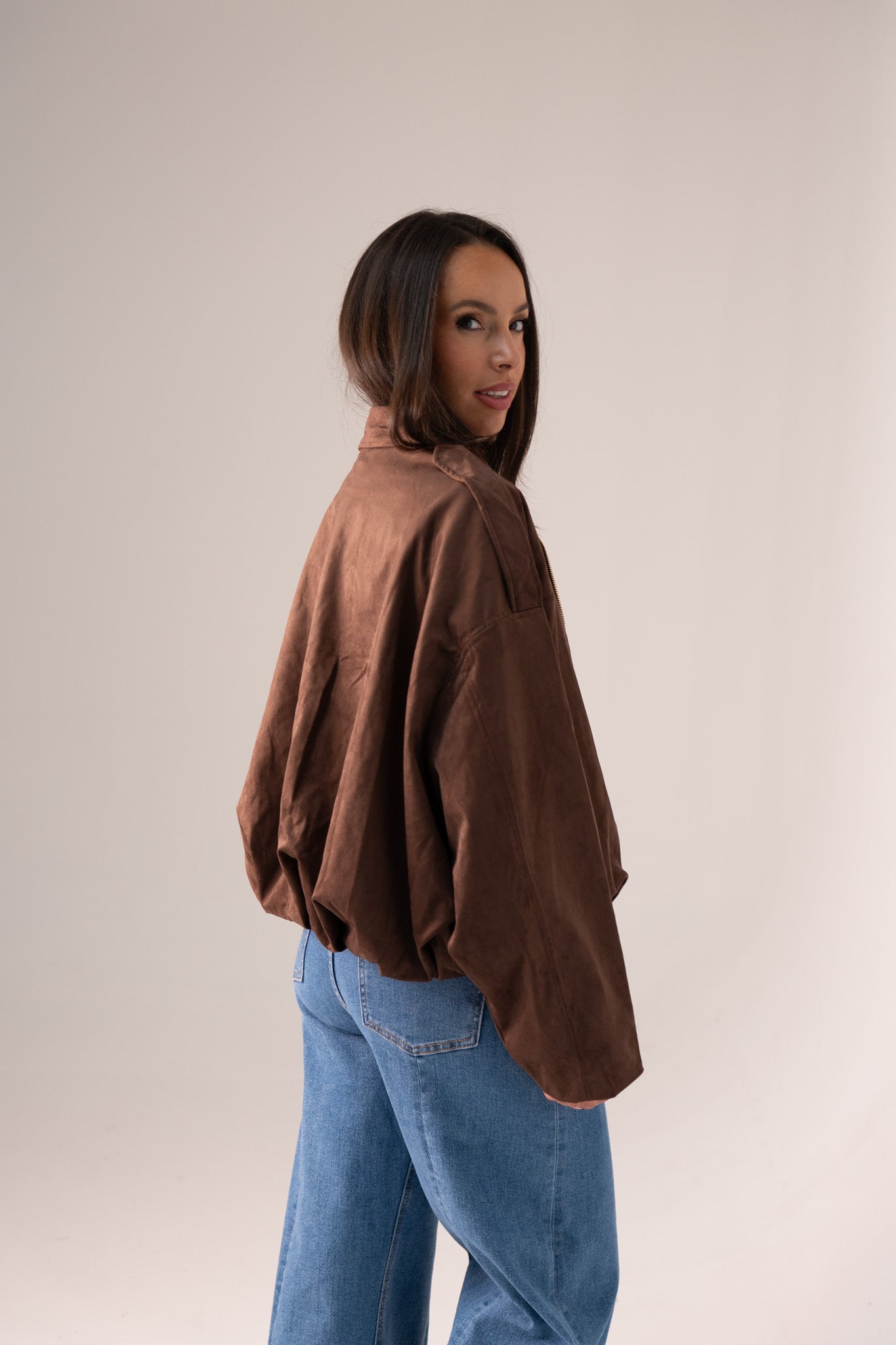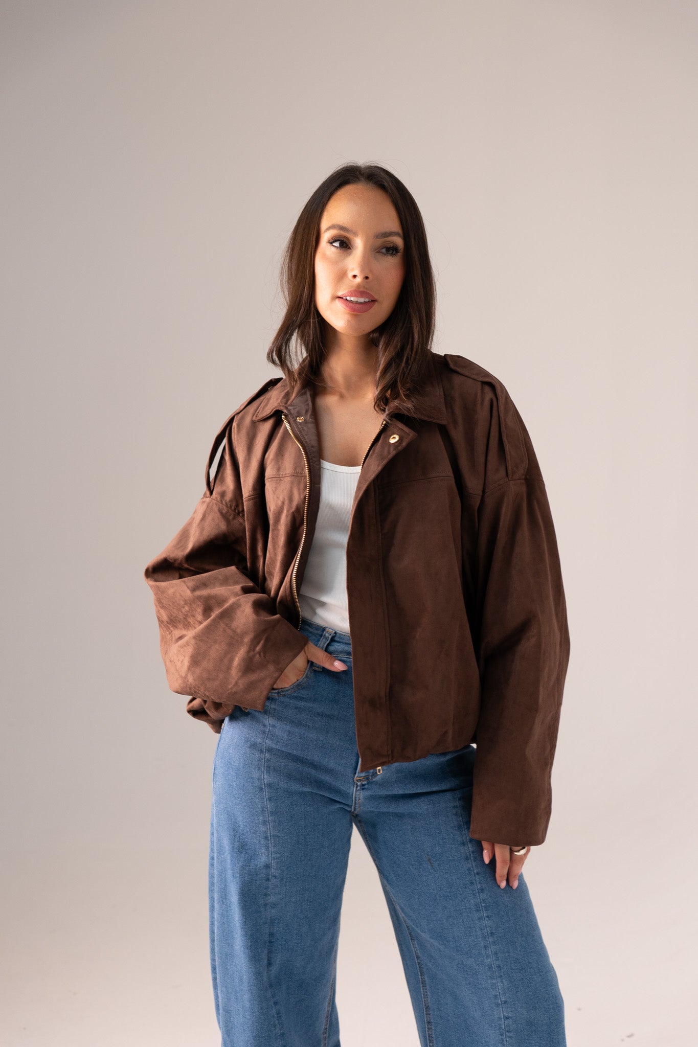 Crafted from soft faux suede, the Ella bomber jacket in chocolate features a flattering bubble hem and elegant shoulder lapels for a modern silhouette. Designed with a collar, drop shoulders, and a secure zip and button front, this one-size piece (fits UK 8-14) offers versatile layering with expert tailoring details. Its rich tone and thoughtful design make it a refined yet casual staple for contemporary wardrobes.