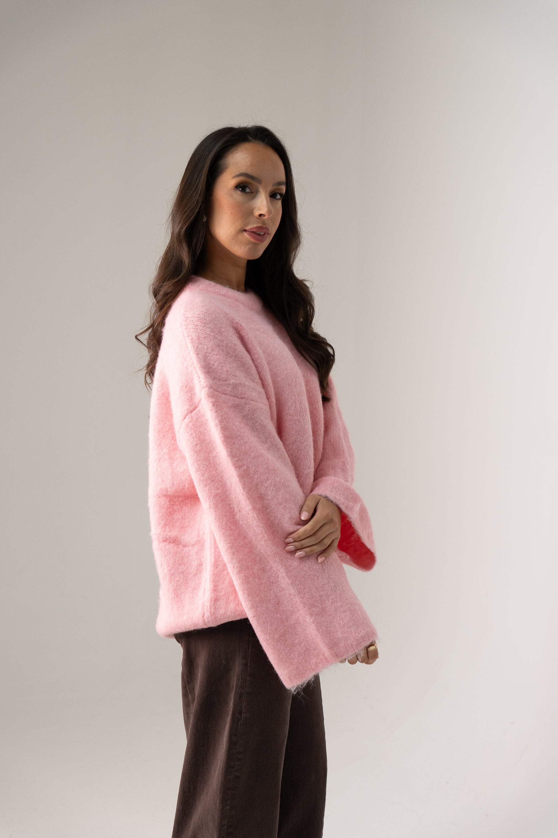 This pink Elsa round neck jumper combines comfort with effortless style. Designed with a relaxed drop shoulder and wide long sleeves, it offers a flattering silhouette for sizes 8 to 14. Crafted from a soft-textured fabric, the jumper features ribbed cuffs and hem that provide a neat finish while maintaining ease of movement. Perfect for layering or wearing alone, it adds a subtle pop of colour to any wardrobe.