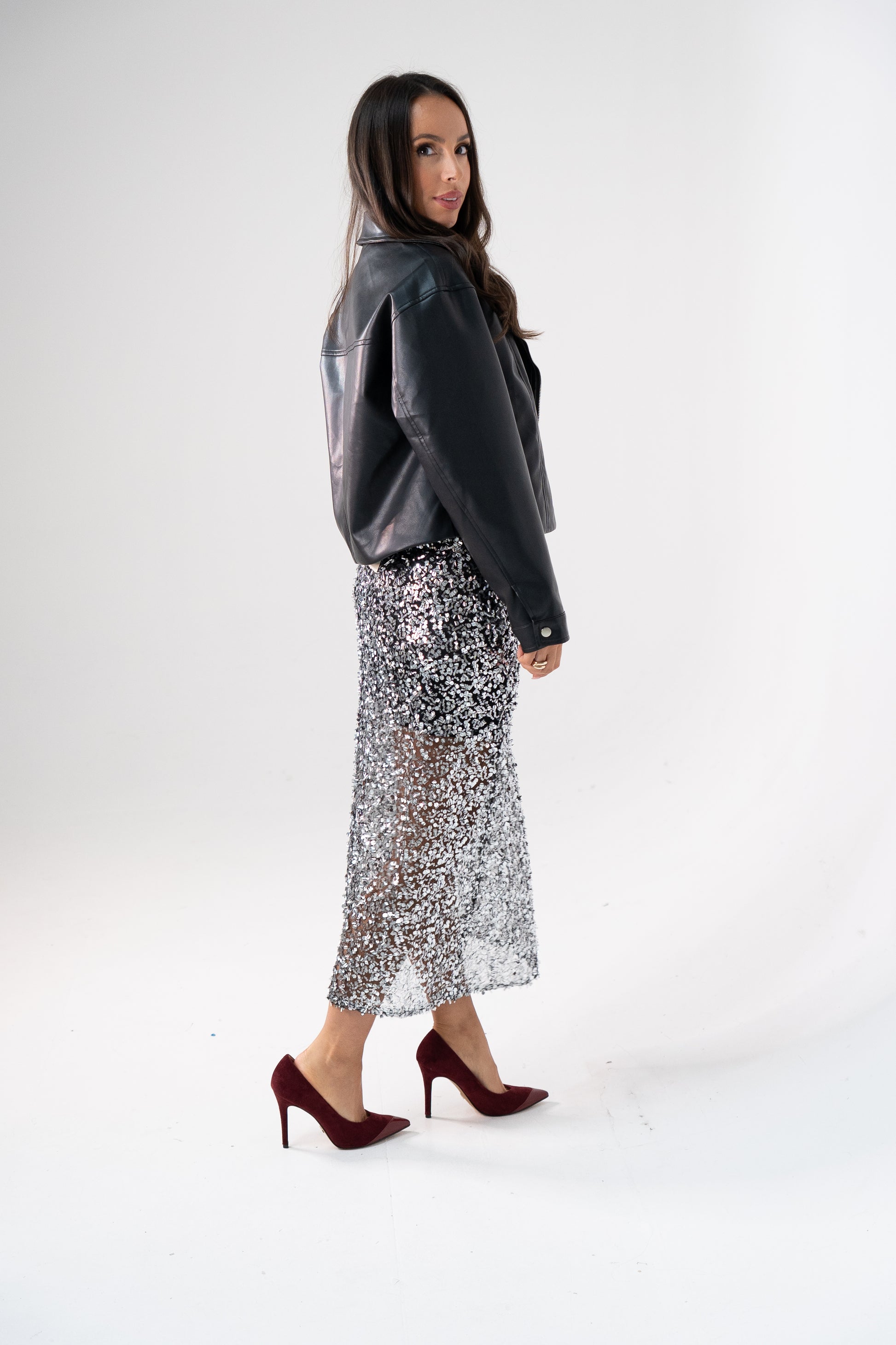 Elevate your evening wardrobe with this striking Kate Sequin Midi Skirt. Crafted in luxurious black fabric with shimmering silver sequin embellishments, this piece delivers sophisticated glamour for special occasions. The elasticated waist ensures a comfortable, flattering fit, while the midi length offers versatile styling options. Featuring sheer panelling and partial lining, it balances elegance with practicality. A statement skirt that transitions effortlessly from formal events to upscale gatherings.