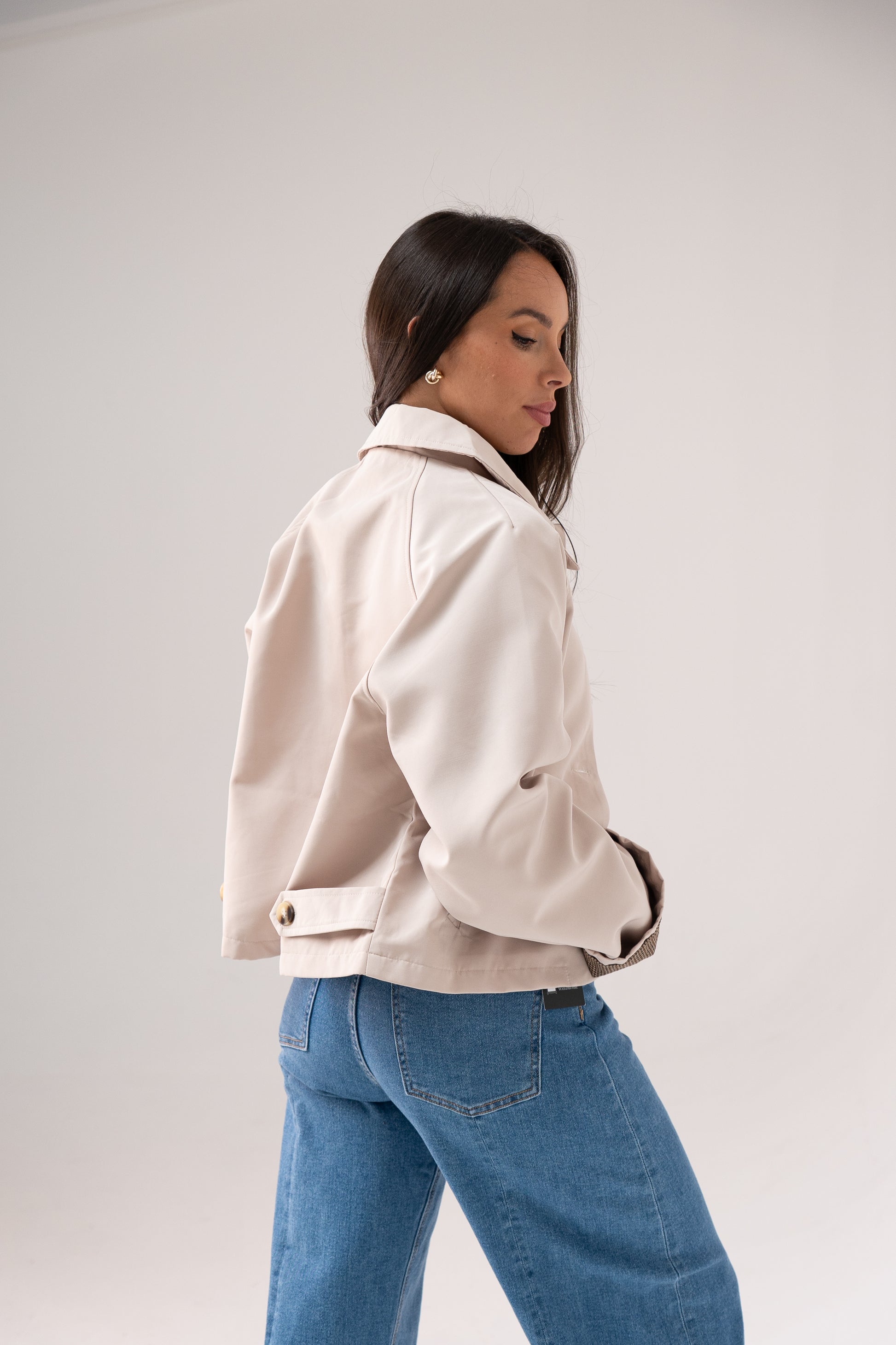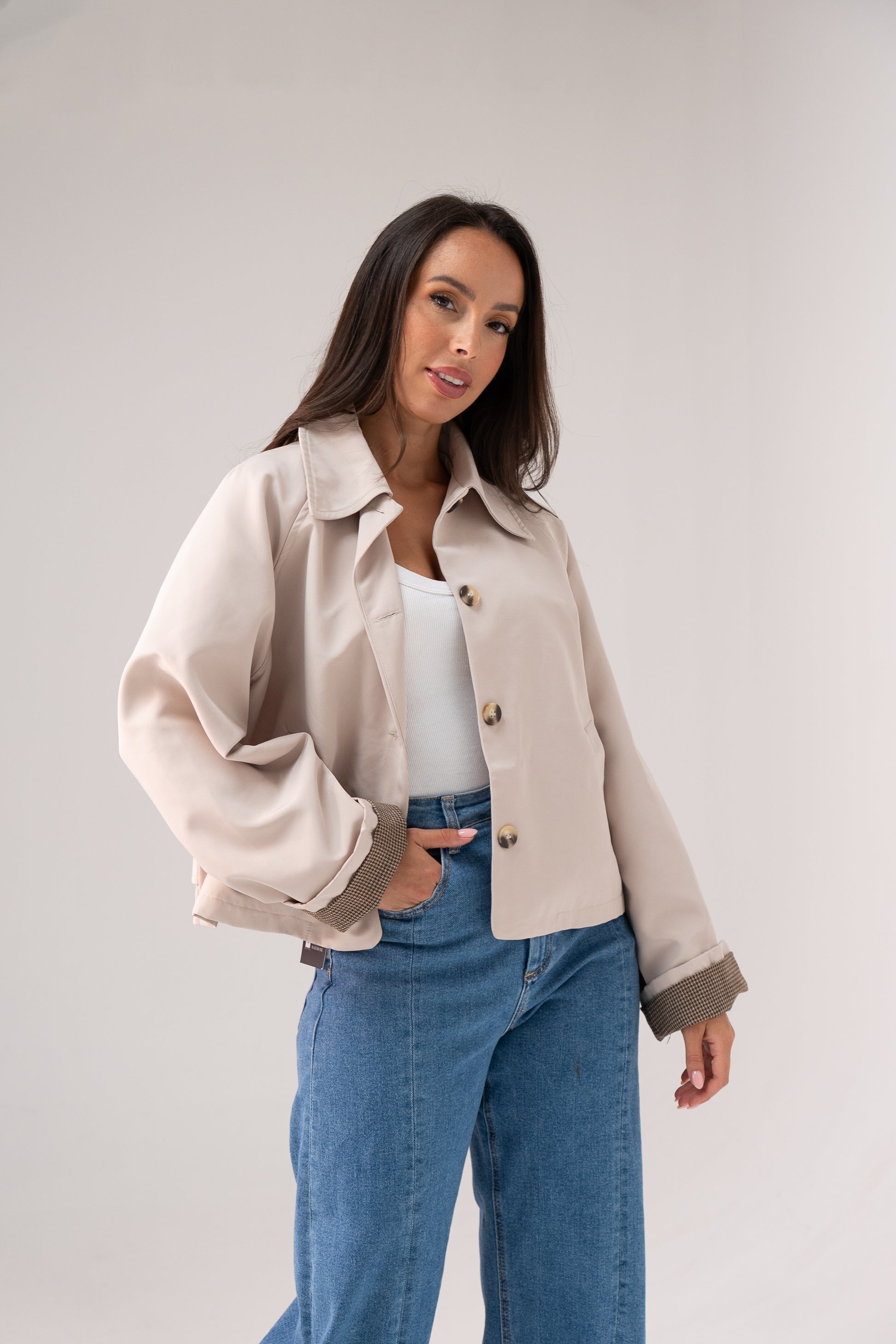 The Kiera Contrast Cuff Jacket in Neutral showcases meticulously designed contrast check material on the turn-up cuffs and collar, adding a refined touch to its neutral base. Featuring a button-front closure and carefully crafted button details, this jacket combines style with functionality. Practical pockets enhance everyday usability, making it a versatile piece for a polished yet understated look.