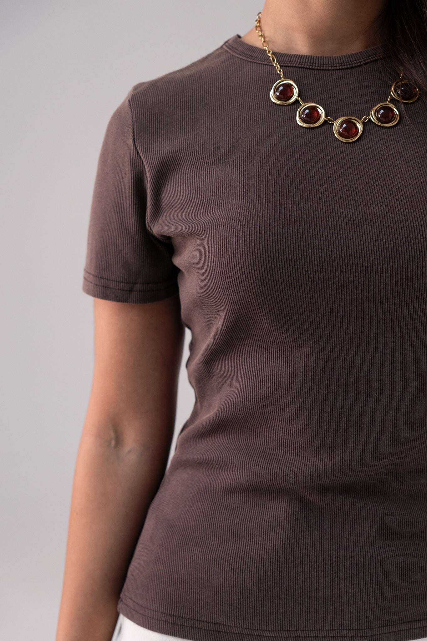 The Kiera Ribbed T-Shirt in Brown offers a refined blend of comfort and style with its soft cotton mix fabric and ribbed texture. Designed with a classic round neck and short sleeves, it serves as an essential wardrobe staple that pairs effortlessly with various outfits, providing both breathability and a subtle structured look. Ideal for layering or wearing on its own, this versatile piece brings understated sophistication to your everyday wear.