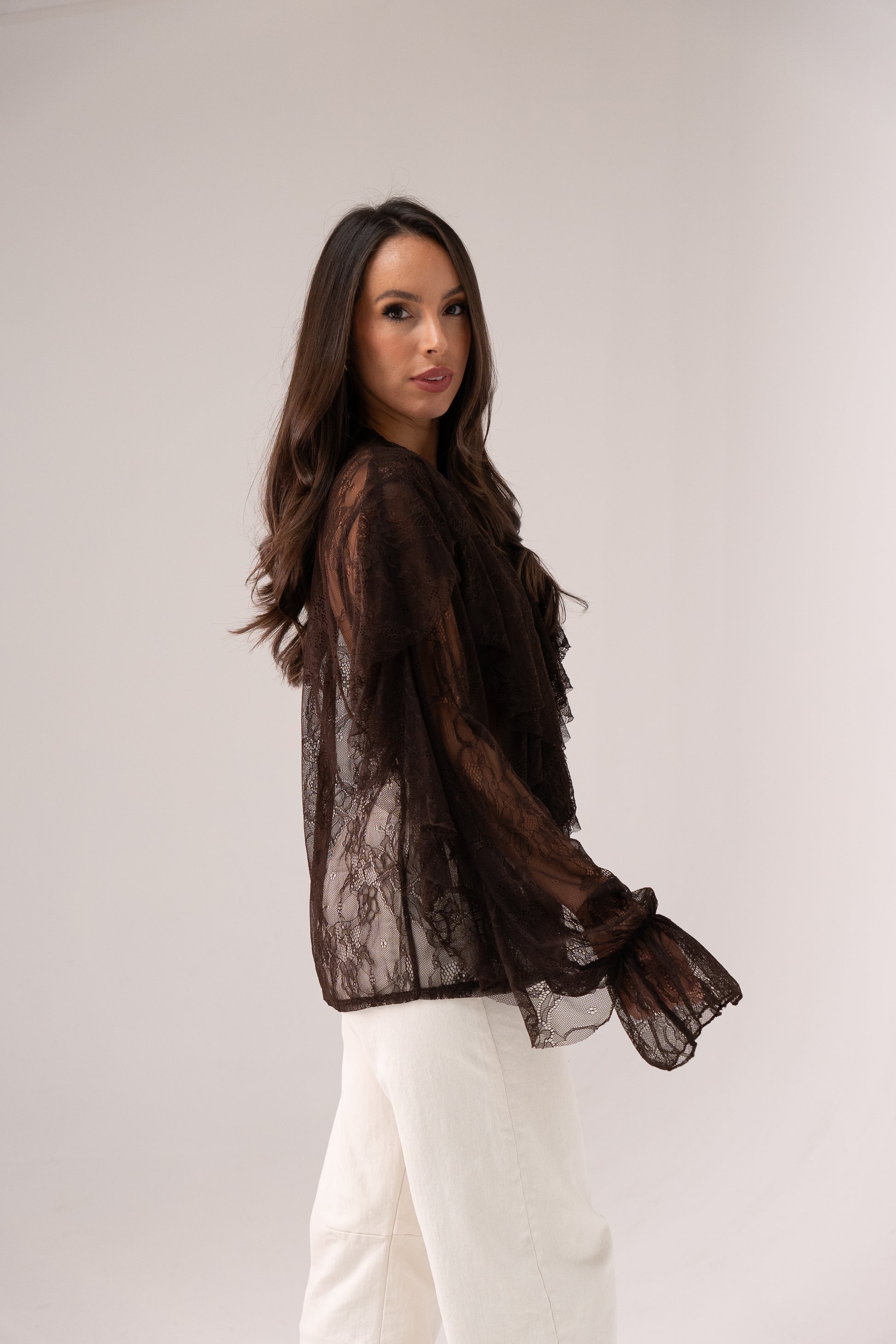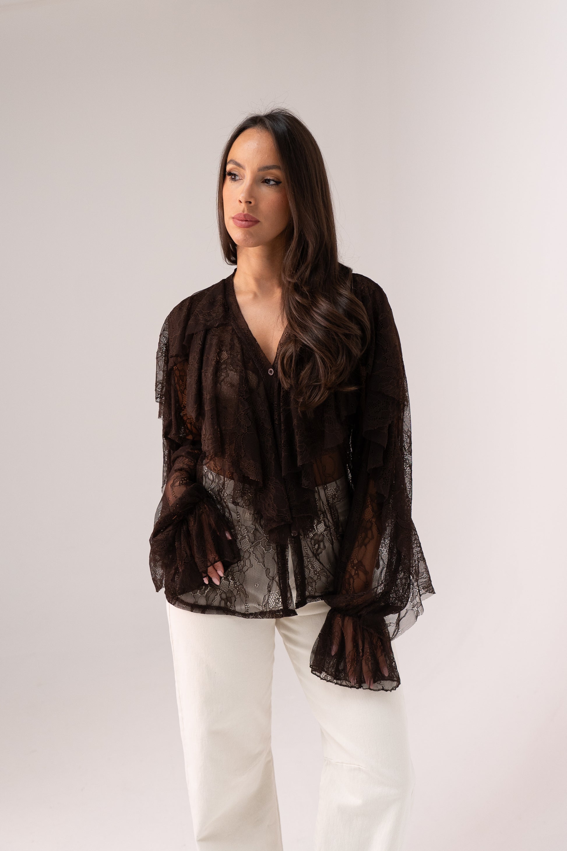 The Leah Lace Blouse in Chocolate showcases an expert blend of delicate design and versatile wearability. Featuring a flattering V-neck and sheer button-front detailing, this blouse offers a refined, layered look with its intricate lace overlay. The long sleeves finish with elegant frill cuffs, adding subtle sophistication. Designed to fit sizes 8 to 14 comfortably, it provides a graceful silhouette suitable for both professional settings and stylish evenings out. Its rich chocolate hue enhances its timeless appeal, making it a distinguished addition to any wardrobe.