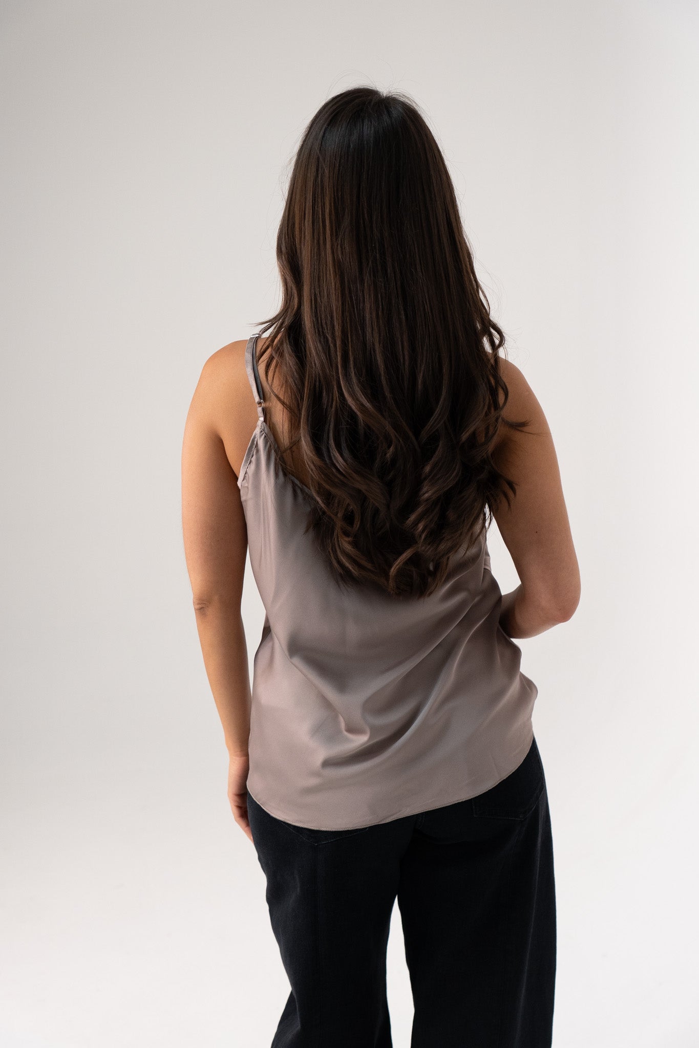 The Leah Lace Trim Cami in Bronze is crafted from smooth satin, featuring a delicate lace-trimmed V-neckline that adds a touch of refined femininity. Its sleek silhouette offers effortless elegance, making it a versatile layering piece or a standalone statement for both day and evening wear. This cami combines luxurious texture with subtle detailing to elevate any outfit.