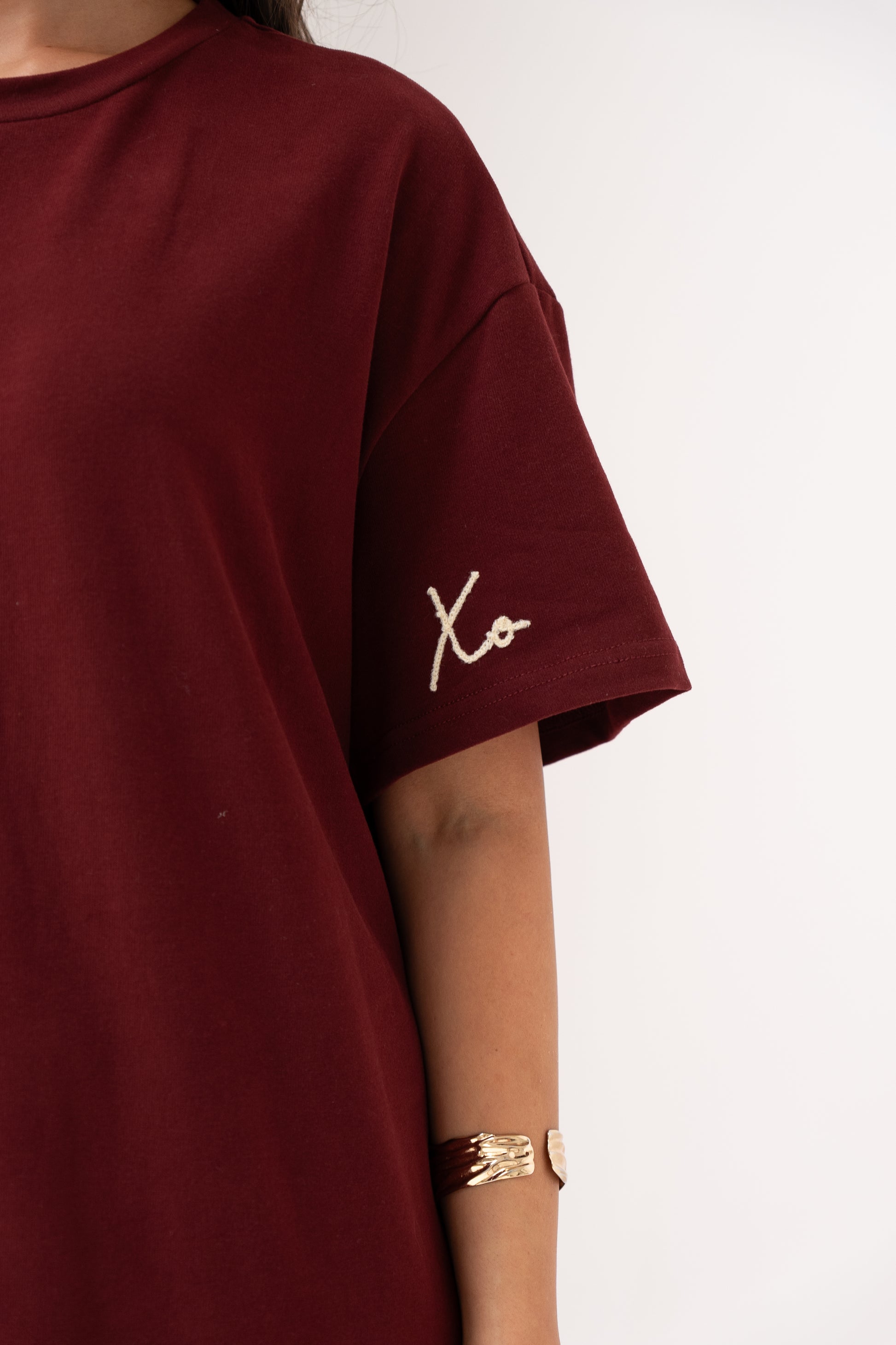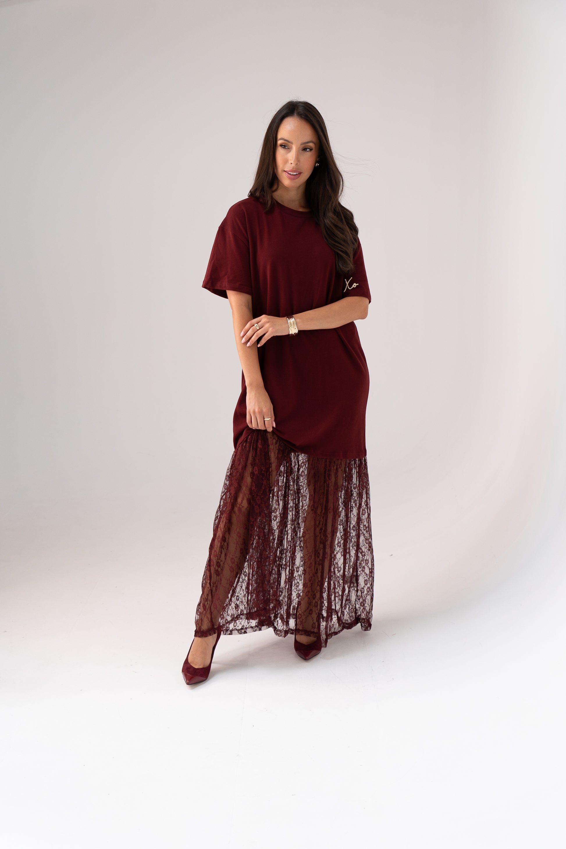 The Love Laura Contrast T-Shirt Dress in Burgundy offers a sophisticated take on casual wear. Featuring a comfortable round neck and short drop shoulder sleeves, it highlights delicate XO detail cuffs and a contrasting lace bottom, adding subtle elegance. Crafted to flatter, this dress is available in sizes 6 to 18, making it an ideal choice for those seeking both style and comfort.