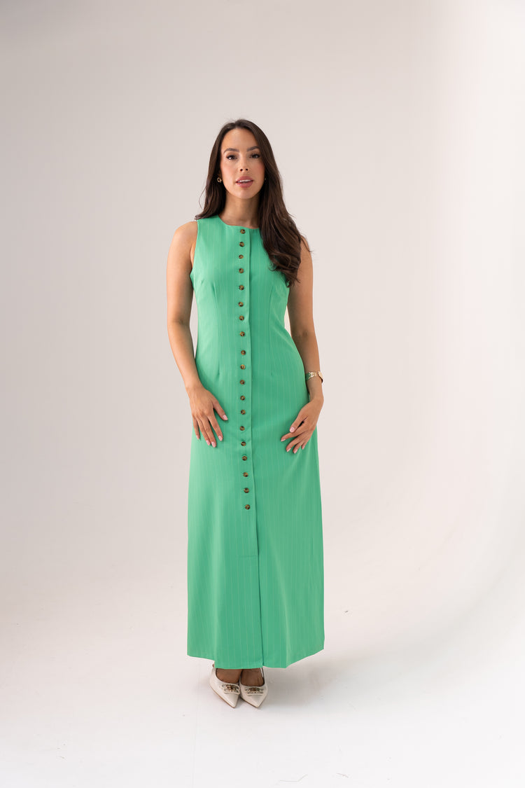 This Love Laura pinstripe shirt dress in mint combines classic style with modern details. Available in sizes 6 to 18, it features a round neck and sleeveless design for a fresh, airy feel. The white pinstripe pattern adds subtle sophistication, while the lined fabric ensures comfort and quality. Practical elements like a button-front closure and back zip provide ease of wear, making it a versatile choice for both casual and polished looks.