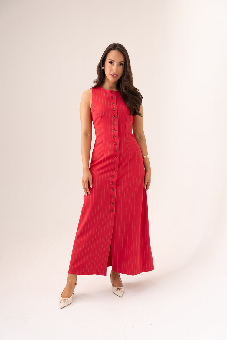 The Love Laura Pinstripe Shirt Dress in Raspberry combines classic tailoring with a fresh, modern twist. Available in sizes 6-18, this sleeveless dress features a round neck, subtle white pinstripes, and a lined interior for comfort. The button-front design and discreet back zip ensure a flattering fit and easy wear. Perfect for both professional and casual settings, it offers a polished look with effortless style.