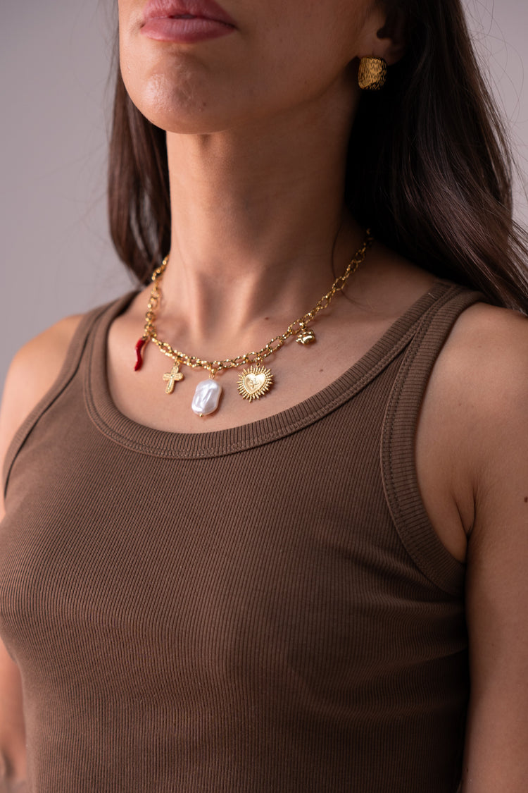 The Polly Charm Necklace in Gold features a versatile one-size design crafted from durable stainless steel with a lustrous gold finish. Its adjustable clasp closure ensures a comfortable fit, while the elegant link chain is adorned with multiple charms for a sophisticated, layered look. This necklace offers both style and resilience, making it a refined accessory suitable for everyday wear or special occasions.