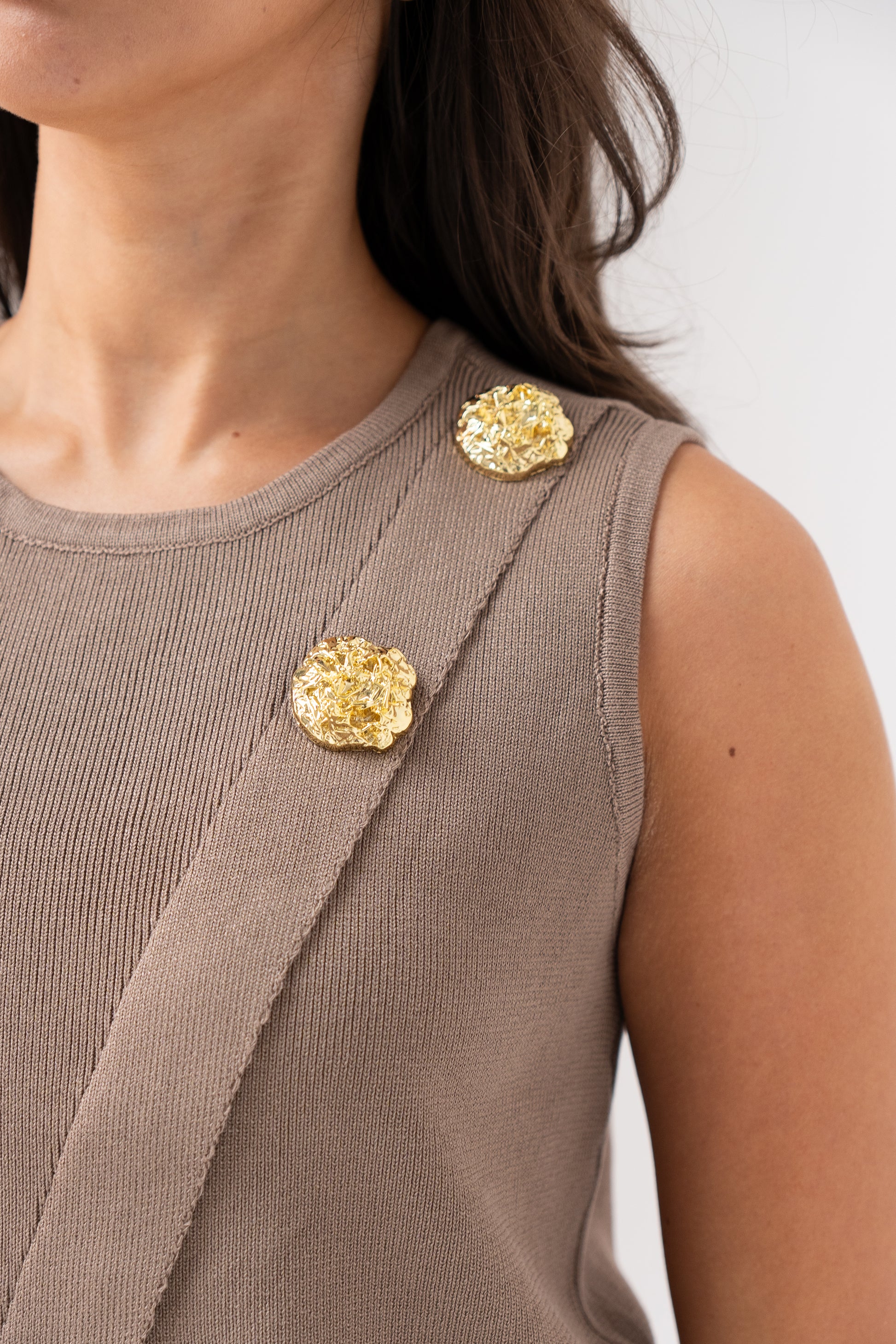 This fine knit sleeveless top features a stylish asymmetric front and elegant gold button detail, perfectly blending modern design with timeless appeal. Its versatile taupe shade complements a range of outfits, while the comfortable round neck and flexible one-size fit (UK 8-14) ensure a flattering silhouette. Ideal for layering or wearing alone, this piece elevates any wardrobe with understated sophistication.