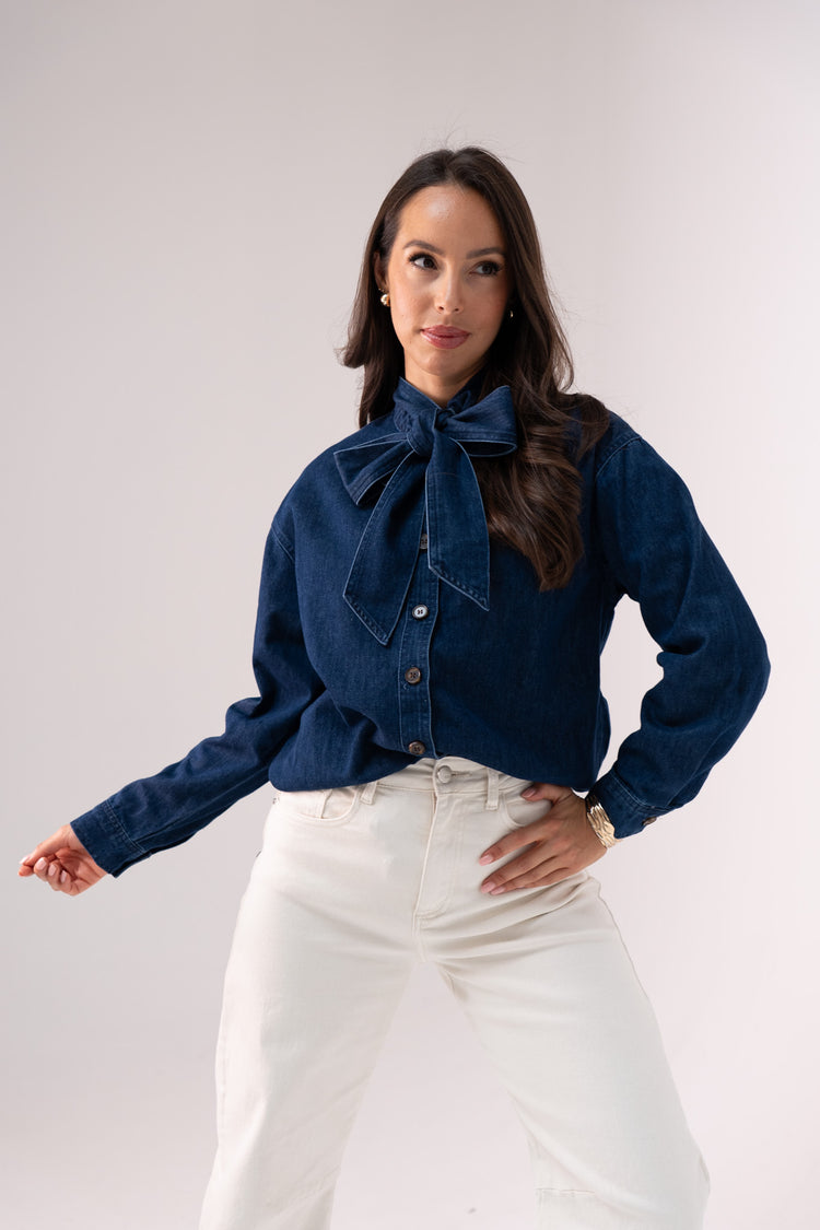 This Daisy Bow Collar Denim Shirt in Dark Wash combines timeless denim with refined details for a versatile wardrobe staple. Featuring a drop shoulder design and long sleeves, it offers a relaxed yet polished silhouette. The button-front closure ensures easy wear, while the tie-detail bow collar adds a subtle feminine touch. Crafted in a rich dark wash, this shirt balances classic style with contemporary flair, making it ideal for both casual and smart-casual occasions.