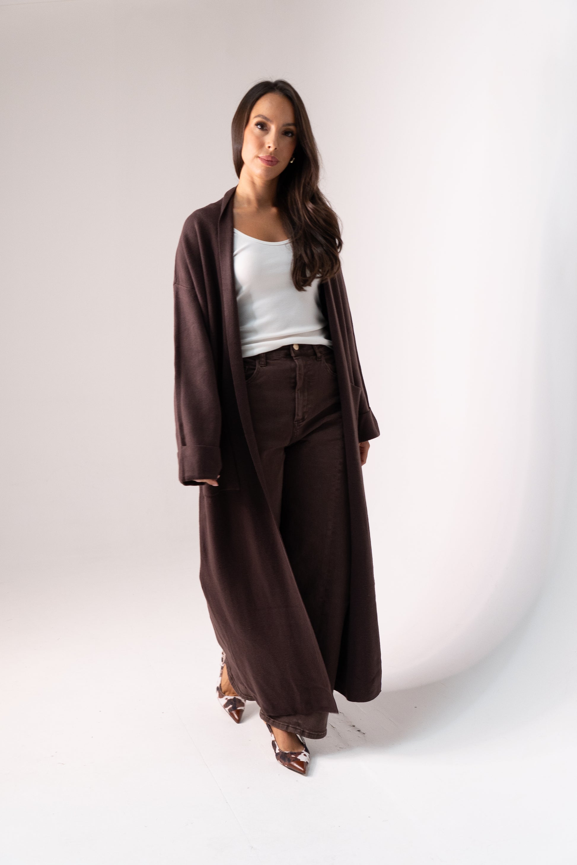 Elevate your layering with the Ella Longline Cardigan in rich chocolate. Crafted from fine knit fabric, this long-sleeve cardigan features an open front and convenient pockets for practicality. Designed to flatter sizes 8-14, it offers a turn-up cuff detail for subtle sophistication. Pair it effortlessly with the matching midi dress for a coordinated, polished look. Ideal for transitional seasons, this cardigan combines comfort with versatile style.