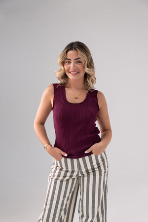 This expertly designed vest features a scoop neck and ribbed fabric that ensures a comfortable, flattering fit. Its sleeveless cut makes it ideal for layering or wearing alone in warmer weather. The delicate lace-effect trim adds an elegant detail, while the rich chocolate colour offers a versatile and sophisticated addition to any wardrobe.