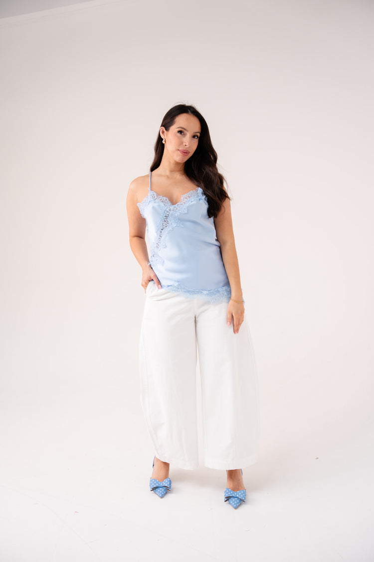 Kendra Asymmetric Lace Trim Cami In Sky Blue