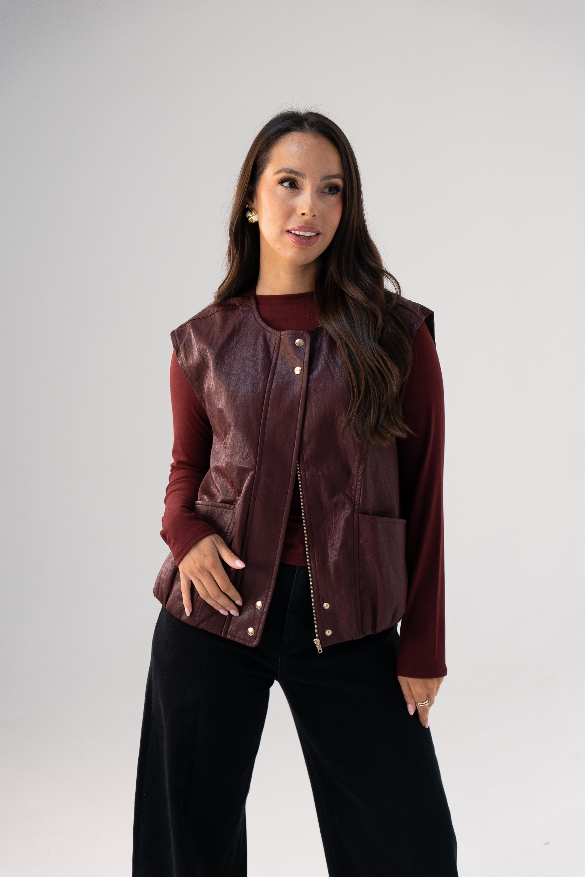 Kendra Faux Leather Sleeveless Jacket In Bordeaux