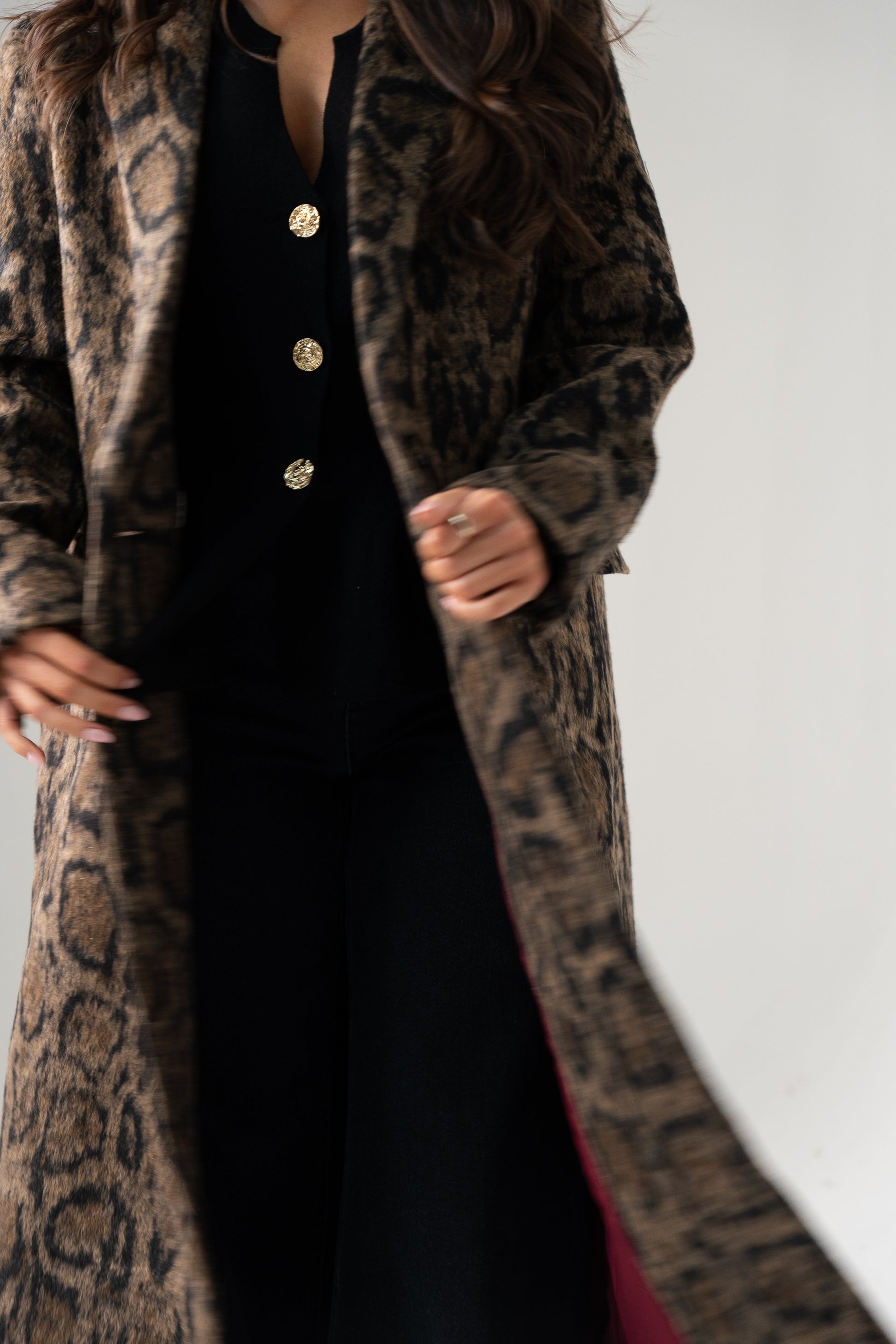 Make a statement with the Love Laura Burgundy Lined Coat In Leopard, a sophisticated outerwear essential that marries bold pattern with refined tailoring. The eye-catching leopard print is beautifully offset by a luxurious burgundy lining, while the double-breasted button front and crisp collar deliver classic polish. Thoughtful design details—including button-adorned cuffs and a graceful back split—ensure both style and ease of movement. Available across sizes 6-18, this coat works as a versatile layering piece for any occasion.