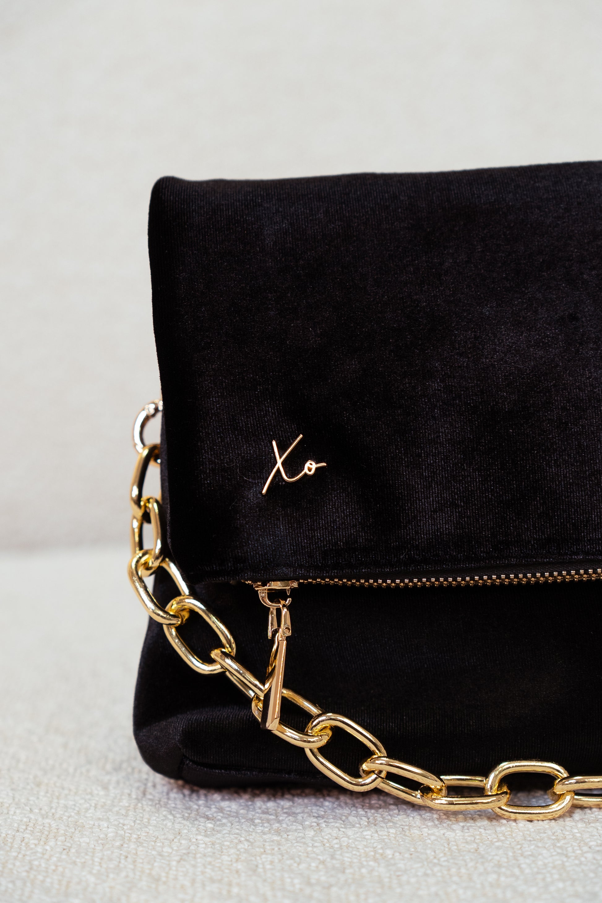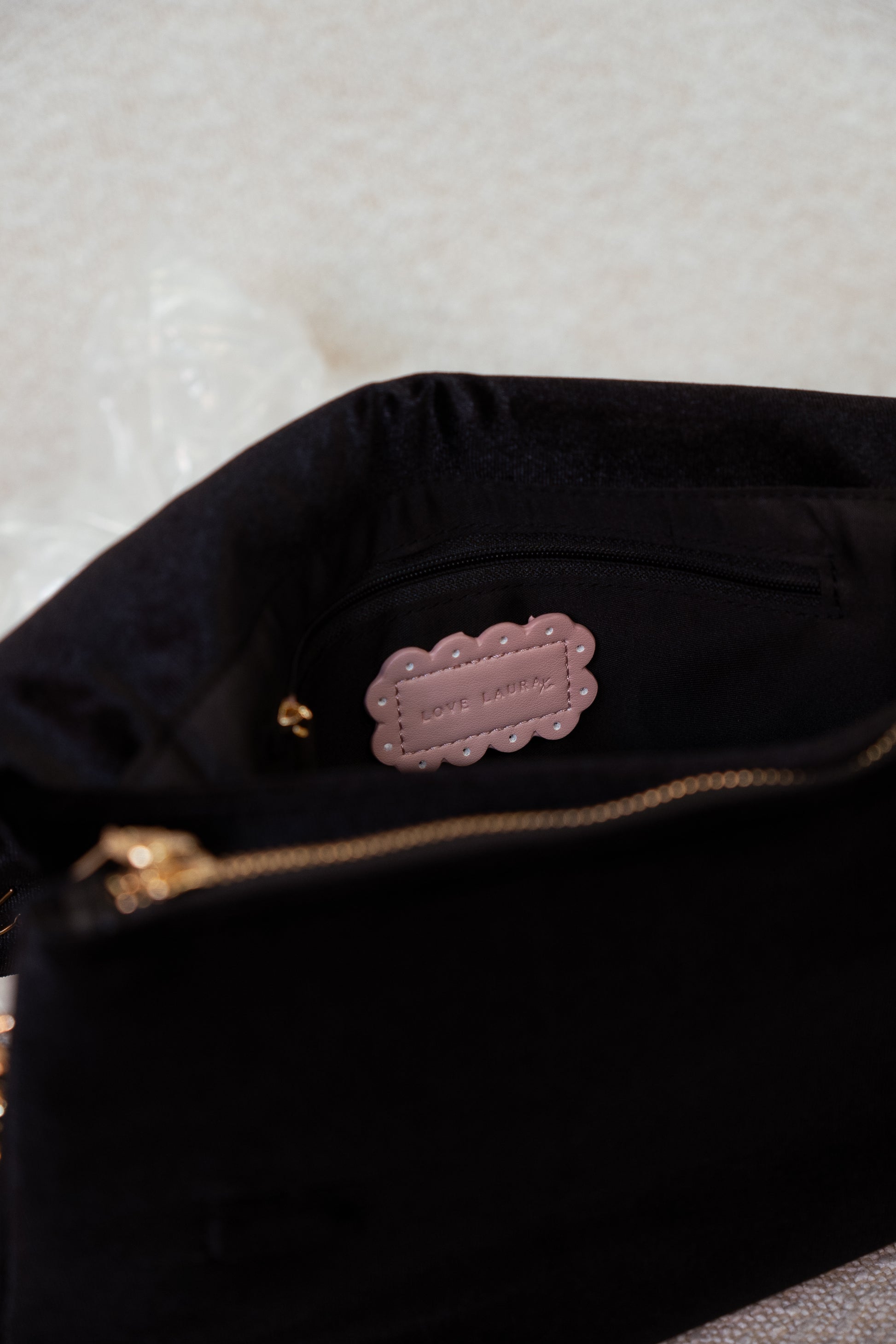 The Love Laura Chain Detail Bag in Black combines elegant design with practical functionality. Crafted in a rich black velvet texture, it features a sophisticated gold-colour chain strap and a detachable shoulder strap for versatile wear. Secure your essentials with the gold-colour zip closure and magnetic clasp, while the three inner compartments—plus a large fold-over zip pocket and an inner zip pocket—offer organized storage. Accented with a subtle gold 'Xo' detail and the Love Laura inner tag, this bag is an expert choice for refined, everyday use.
