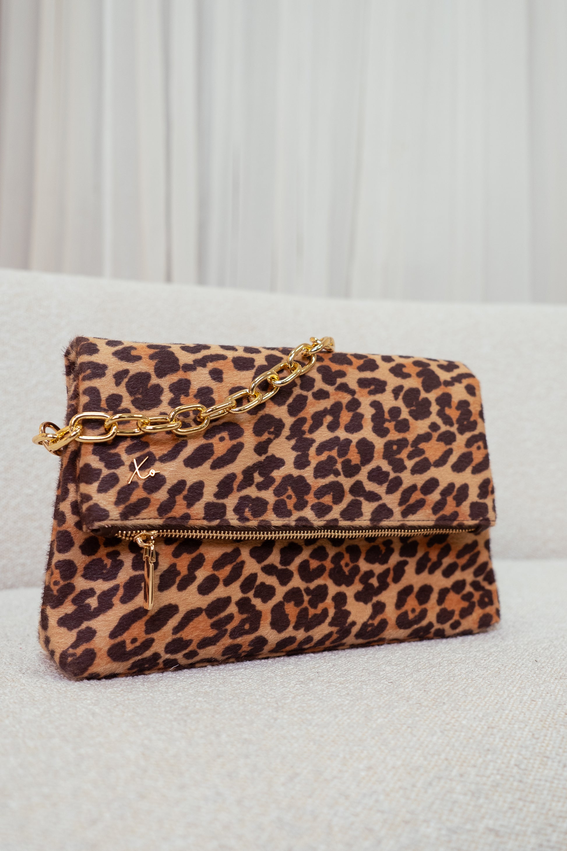 Expertly crafted, the Love Laura Chain Detail Bag in Leopard Print combines bold design with practical features. Featuring a pony texture and lined interior, it includes a gold chain strap alongside an adjustable, detachable brown faux leather shoulder strap for versatile wear. The bag secures with a gold zip closure and magnetic clasp, accented by a distinctive gold 'Xo' detail. Its fold-over style reveals a large zip pocket, while the interior offers three compartments, an inner zip pocket, and a back zip pocket — providing organised storage without compromising on style.