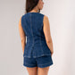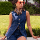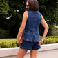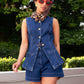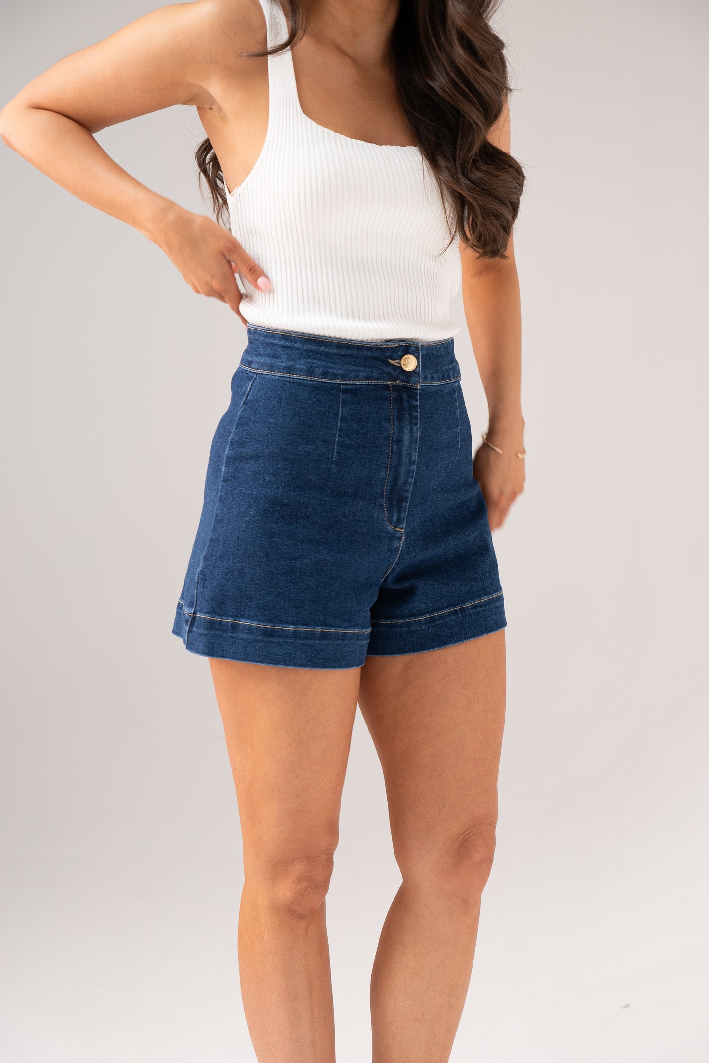 These premium Love Laura denim shorts combine sophistication with casual style. Featuring a flattering high waist design with elegant pleat detailing, these dark wash shorts offer versatile styling options for your wardrobe. Secured with a practical zip and button waist closure, they provide both comfort and a tailored fit. Available in sizes 6-18 and complemented by a matching waistcoat for those seeking a coordinated ensemble.
