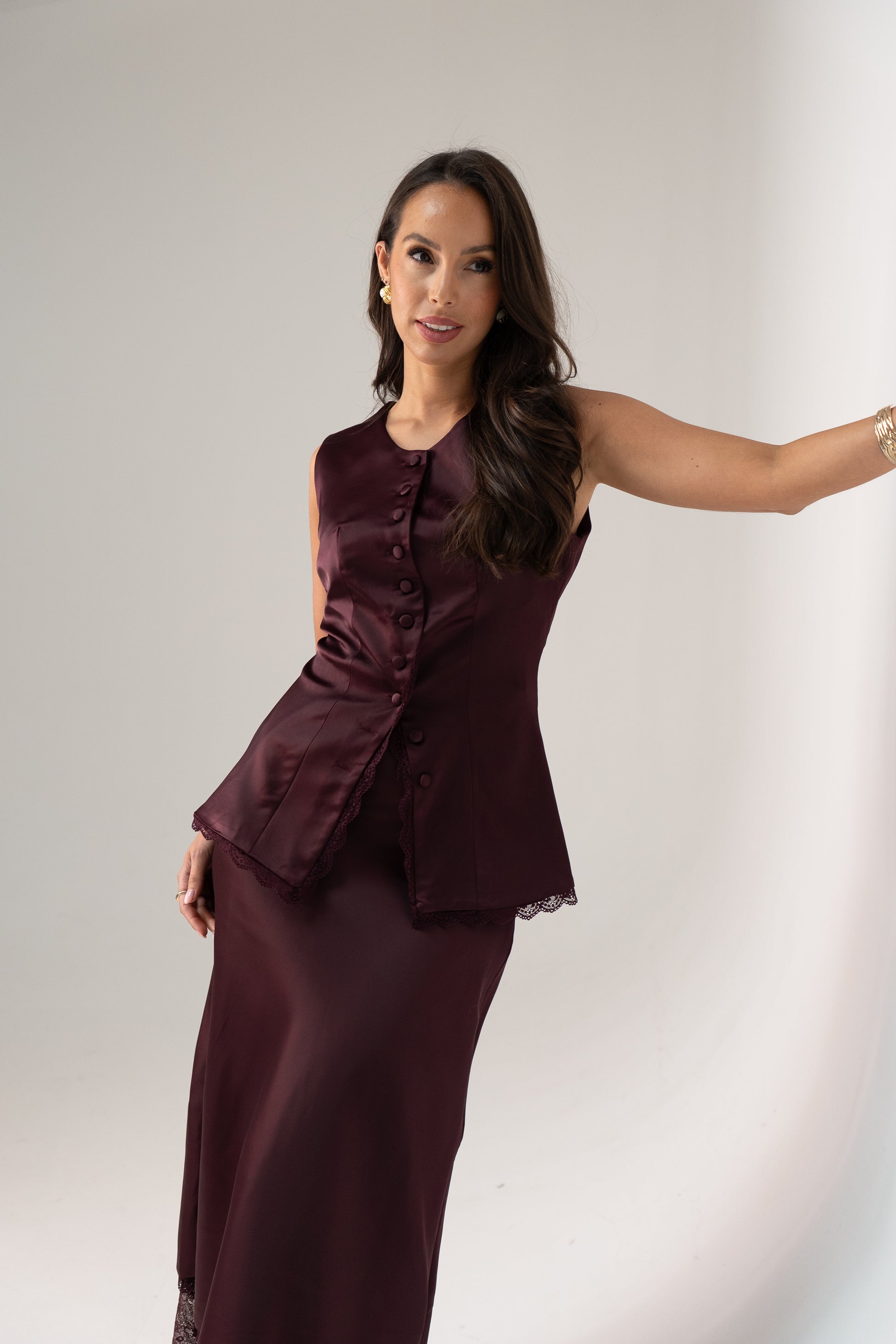 The Love Laura Lace Trim Satin Waistcoat in Burgundy combines elegant design with refined details. Featuring a flattering round neck and sleeveless cut, it offers a comfortable yet polished look. The button-front closure and split hem enhance ease of wear and movement, while scalloped lace trim adds a delicate, sophisticated finish. Available in sizes 6-18 and designed to coordinate perfectly with its matching skirt, this waistcoat is ideal for elevating both formal and smart-casual ensembles.