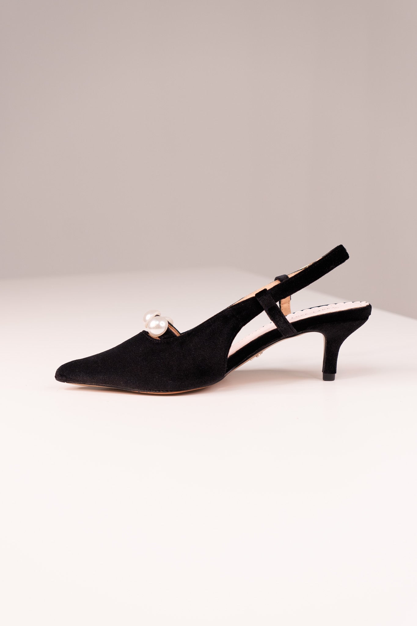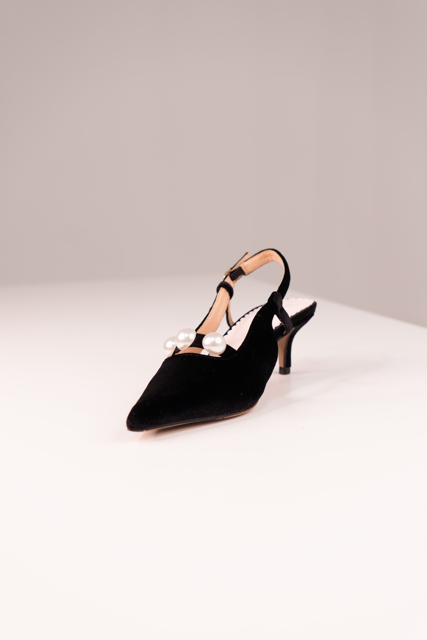 The Love Laura Pearl Detail Kitten Heel in Black combines luxurious velvet with elegant accents for a sophisticated look. Featuring a rich black velvet upper accented by a pearl detail at the front and a gold buckle strap, this pointed toe slingback offers refined style and secure fit. The comfortable Love Laura branded insole and gold 'xo' sole detail complete the design. Available in UK sizes 3-8, this kitten heel is perfect for adding understated elegance to any outfit.