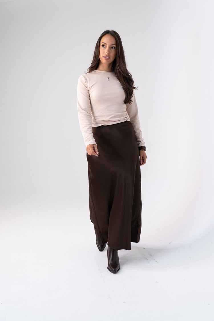 The Love Laura Slip Skirt in Chocolate offers a sleek midi-length silhouette designed to flatter sizes 6 through 18. Featuring a concealed side zip, it ensures a smooth, seamless fit while maintaining minimalist elegance. Crafted to add versatile sophistication to your wardrobe, this skirt pairs effortlessly with both casual and formal outfits. Its rich chocolate hue brings warmth and depth, making it a refined choice for any occasion.