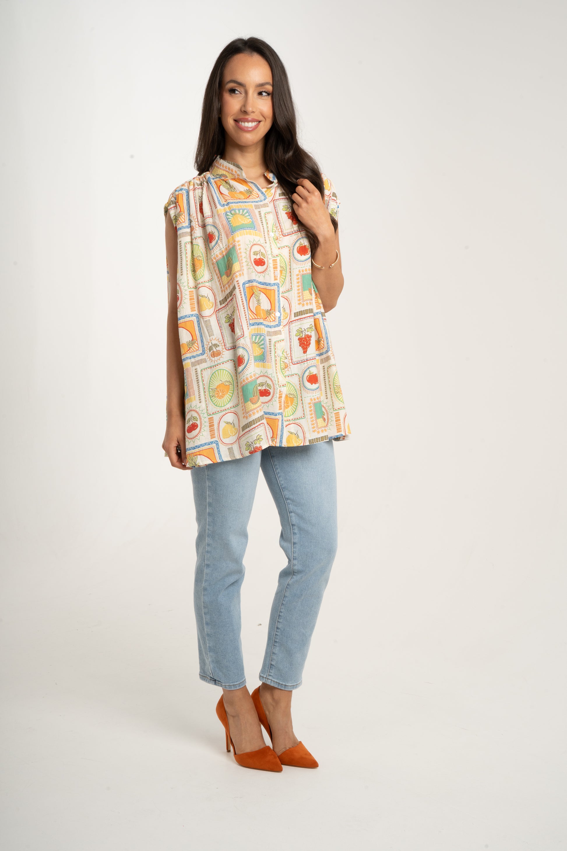 The Millie Fruit Print Shirt In Multi is the perfect blend of style and functionality. With a classic collar and sleeveless design, this shirt features a button front for easy wear. The multi-colour square detail and playful fruit theme print add a touch of fun to any outfit. Stay on trend with this versatile and fashionable shirt.