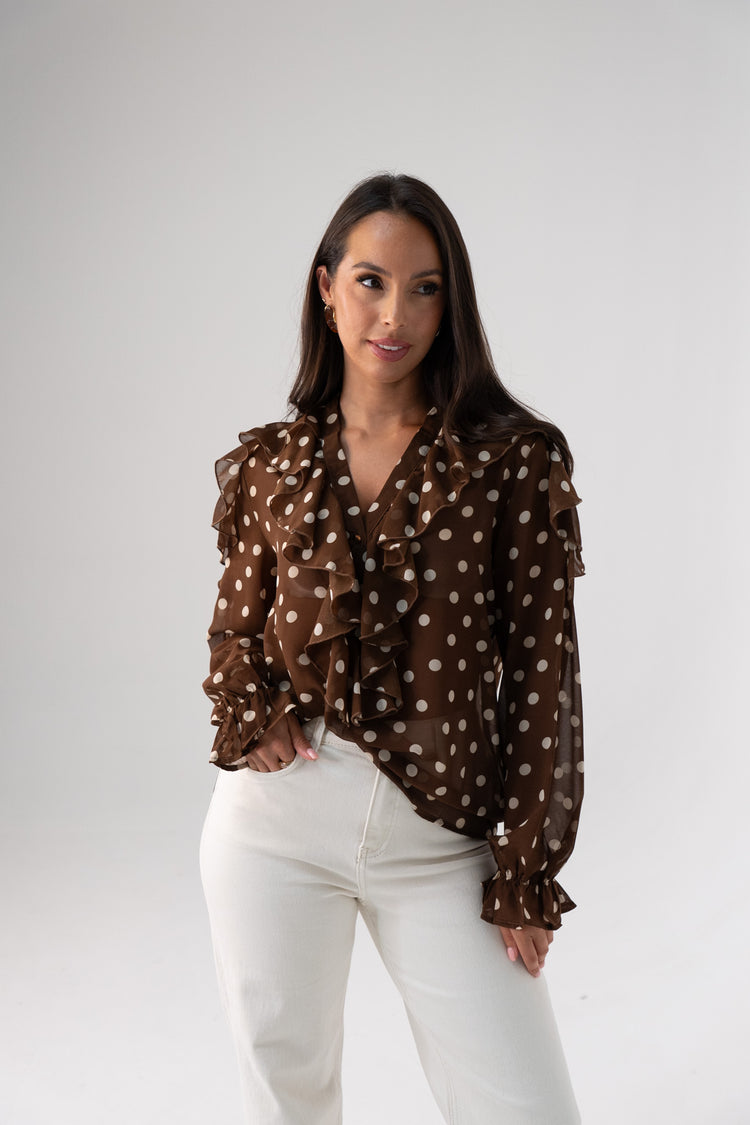 The Millie Sheer Polka Dot Top in Coffee features a sophisticated V-neckline with delicate ruffle detailing on the front and cuffs. Its button-front design and elasticated cuffs offer both style and comfort. Crafted from sheer fabric with a timeless polka dot print, this top adds an elegant, lightweight layer to any wardrobe. Perfect for elevating both casual and formal looks with subtle texture and charm.