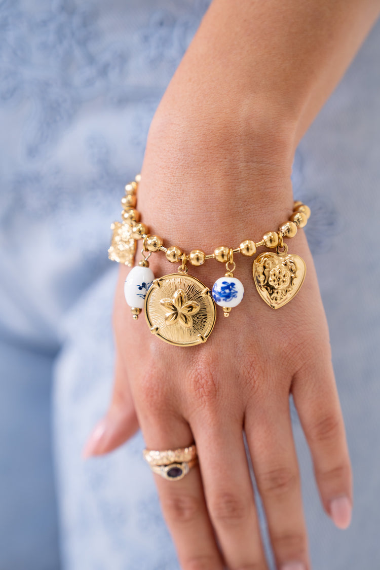 Elegant gold-toned beaded bracelet featuring striking blue and white beads set on stainless steel. The adjustable clasp ensures a comfortable fit for any wrist, while the 22cm length (including clasp) and charms up to 2.7cm wide create a balanced, sophisticated look. To maintain its lustre, remove before showering, swimming, or applying lotions, hairspray, and perfume. A timeless piece that effortlessly elevates any outfit.