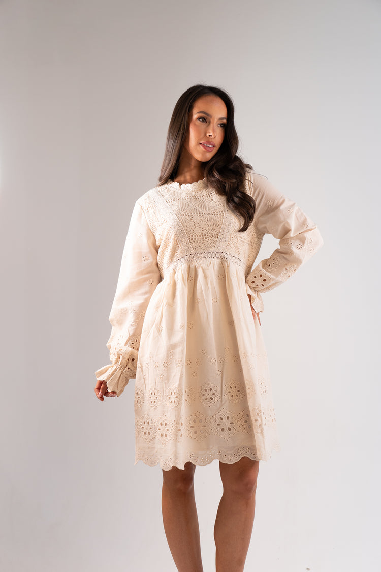 Expertly crafted with delicate broderie anglaise and crochet detailing, this Una dress features a round neck and frill cuffs for a touch of elegance. The long sleeves and lining provide comfort while the neutral colour palette makes it versatile for any occasion. Perfect for a feminine and timeless look.
