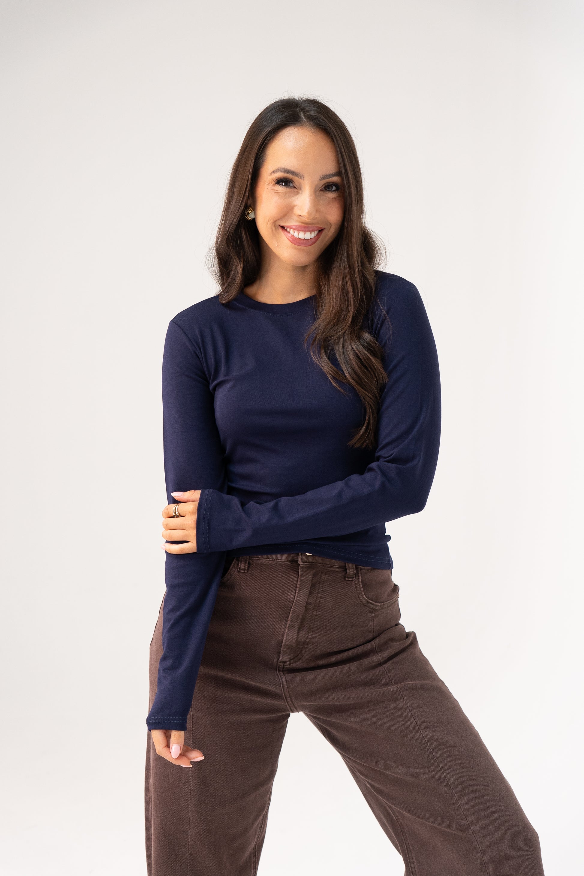 This navy Willow Top combines understated elegance with practical comfort. Constructed from fine stretch fabric, it delivers a refined silhouette without compromising on ease of movement. The round neckline and long sleeves create a polished foundation piece that works beautifully as a standalone garment or layered beneath blazers and cardigans. An indispensable addition to any discerning wardrobe, offering the versatility and quality you'll reach for season after season.